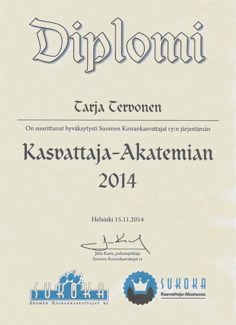 | 15.11.2014 SuKoKa ry:n Kasvattaja-akatemian diplomi pokattu - koulutus alkoi viime tammikuussa ja ahkera uurastus palkittu! Kasvattaja-akatemian diplomi. | |||||